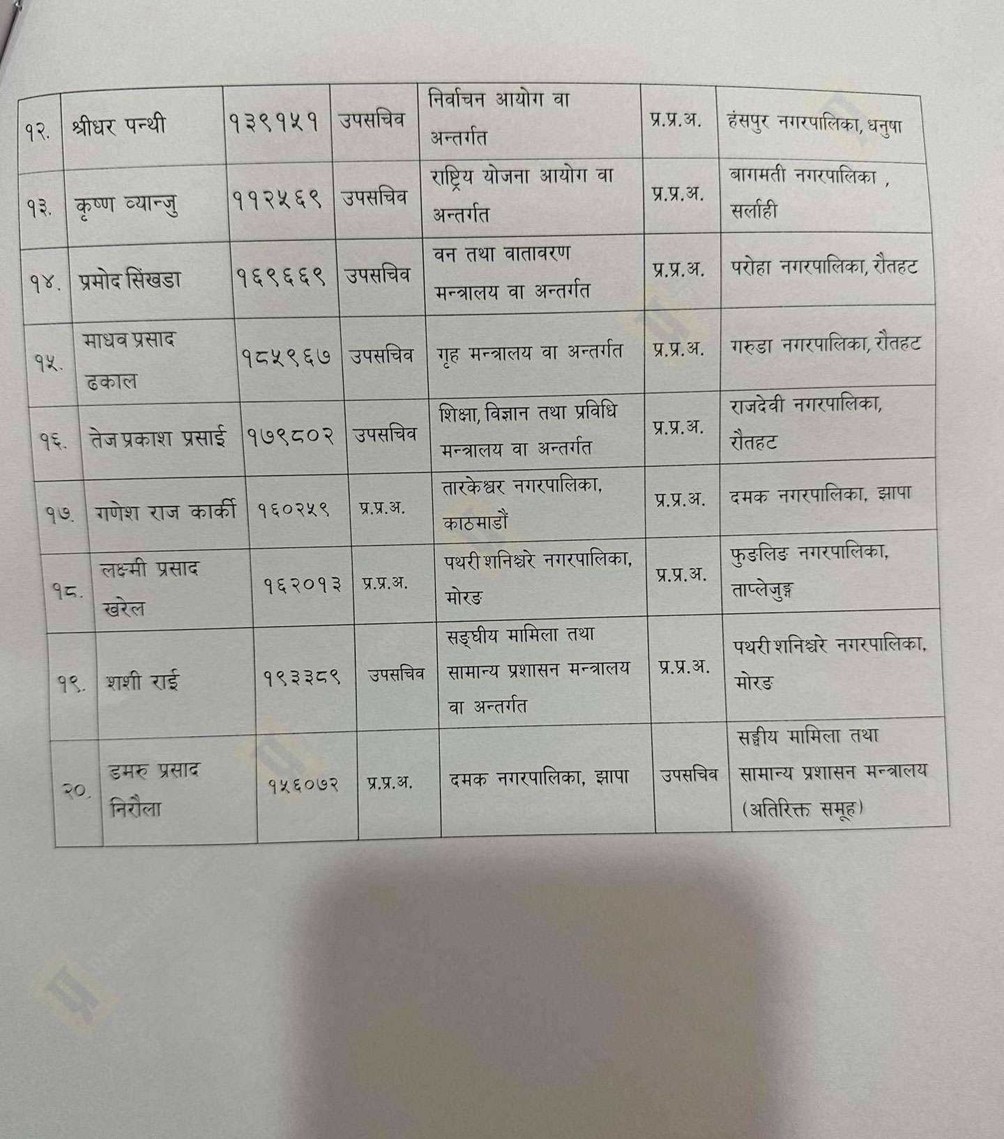 काठमाडौं । संघीय मामिला तथा सामान्य प्रशासन मन्त्रालयले दमकका प्रमुख प्रशासकीय अधिकृत डमरुप्रसाद निरौलासहित २० जना उपसचिव र १८ जना शाखा अधिकृतको सरुवा गरेको छ ।