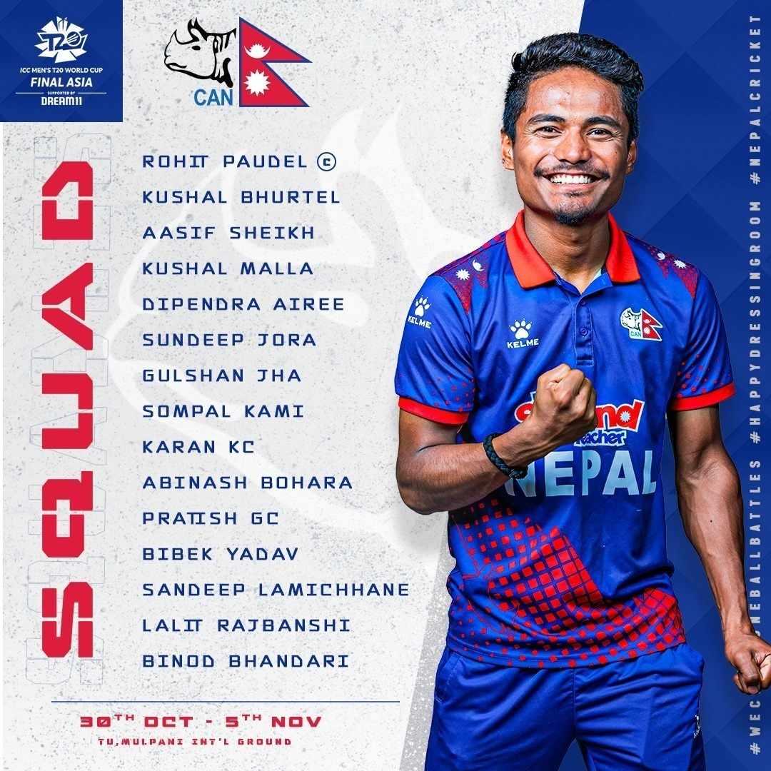 काठमाडौ । लेग स्पिनर सन्दीप लामिछानेलाई समेट्दै आइसिसी टी-२० विश्वकप एसिया क्षेत्र छनोट खेल्ने नेपाली टोलीको घोषणा भएको छ।