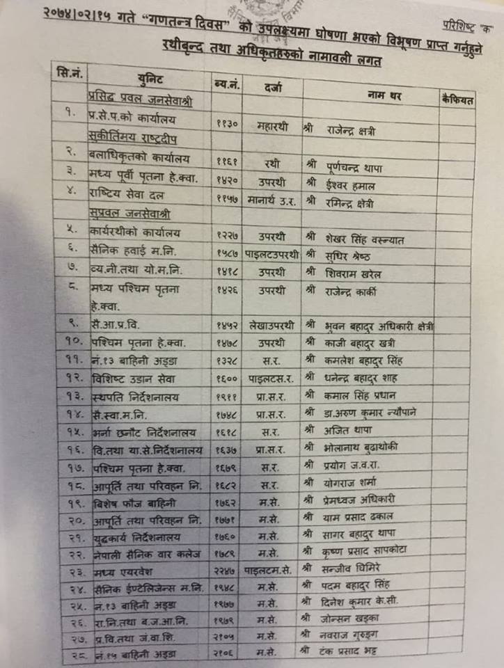 गत साउन २४ बाट विदामा बसेका प्रधानसेनापति राजेन्द्र क्षत्रीले आफुसहित आफ्नो कोटरीमा रहेकालाई मात्र विभूषणका लागी सिफारीस गरेका हुन् । क्षत्रीले आफ्ना दाई रमिन्द्र क्षत्री, नातेदार कृष्ण सापकोटा,लेखाका प्रमुख समेत रहेका उपरथी भुवन बहादुर अधिकारीलगायतलाई विभूषणका लागी सिफारीस गरेका हुन् । क्षत्रीले सेना प्रमुख हुंदा आफु निकटकालाई मात्र अवसर दिएको र सेनालाई व्यापार व्यवसायमा लगाएको भन्दै आलोचित हुने गरेका छन् ।