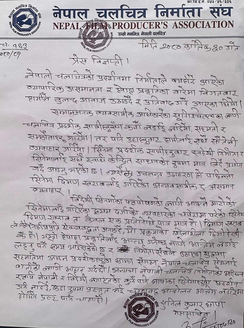 अन्यथा नेपाली चलचित्र निर्माताको अस्तित्व रक्षार्थ नेपाली र विदेशी लगायतको कुनै पनि भाषाका सिनेमाहरुको प्रदर्शन गर्न नदिने उनको चेतावनी छ ।