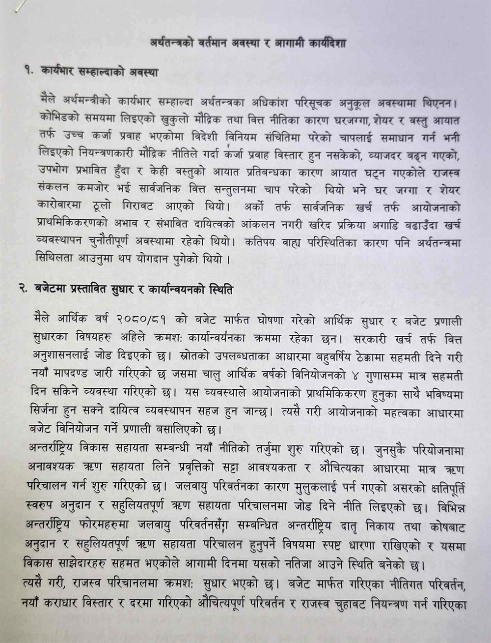 यस्तो छ ‘अर्थतन्त्रको वर्तमान अवस्था र आगामी कार्यदिशा विषयक’ विवरणको पूर्णपाठ