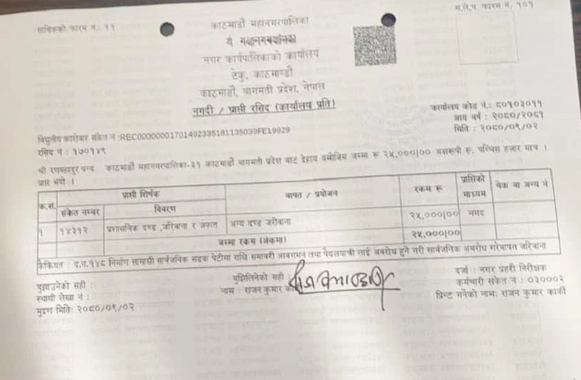 काठमाडौँ । काठमाडौँ महानगरपालिकाले सडक पेटीमा निर्माण सामग्री राखेको आरोपमा २५ हजार जरिवाना तिराएको छ ।