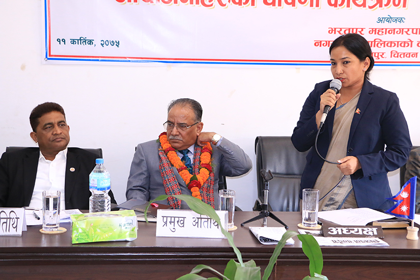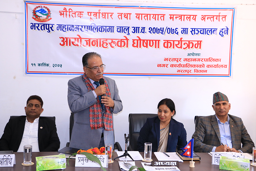 भौतिक पुर्वधार तथा यातायात मन्त्रालय अन्तर्गत भरतपुर महानगरपालिकामा चालु आर्थिक बर्षमा संचालन हुने आयोजनाहरुको घोषणा कार्यक्रमलाई सम्बोधन गर्दै अध्यक्ष प्रचण्डले चितवन ऐतिहासिक विशेषताले गर्दा भौतिक पुर्वधार तथा यातायात मन्त्रालय, शहरी विकास मन्त्रालय तथा खानेपानी तथा सरसफाई मन्त्रालयले विषेश चासोका साथ चितवनलाई ध्यान दिईरहेको जानकारी दिनुभयो ।