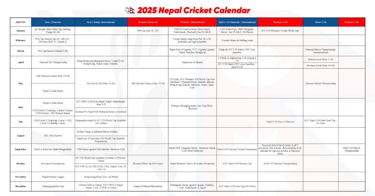 क्यालेण्डर अनुसार सबैभन्दा बढी पुरुष किक्रेट टाेलीकाे खेल खेलाइनेछ । पुरुष क्रिकेटका लागि बाह्रै महिना खेल हुनेछ भने सबैभन्दा कम महिला यू १६काे एउटा मात्र खेल हुने भएकाे छ ।