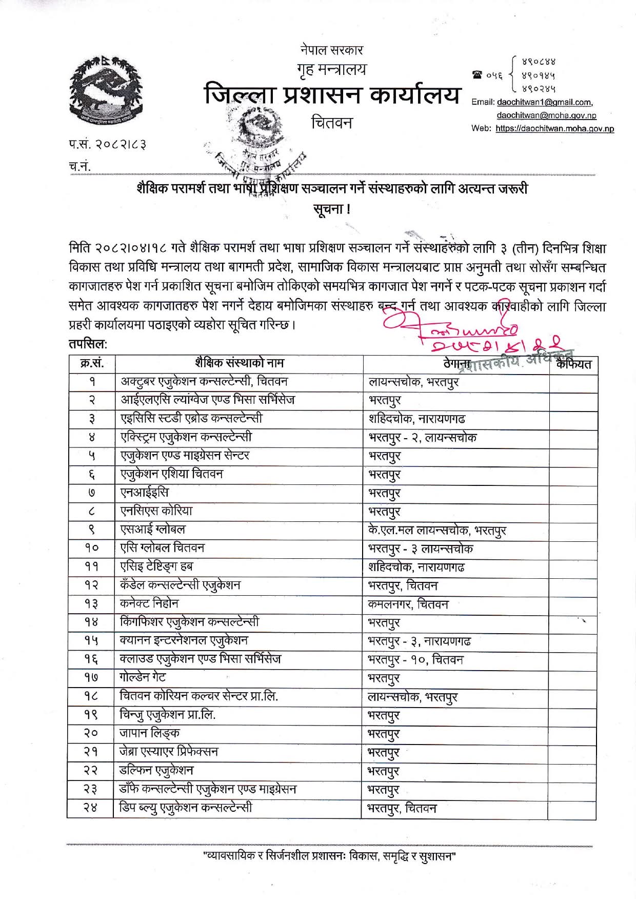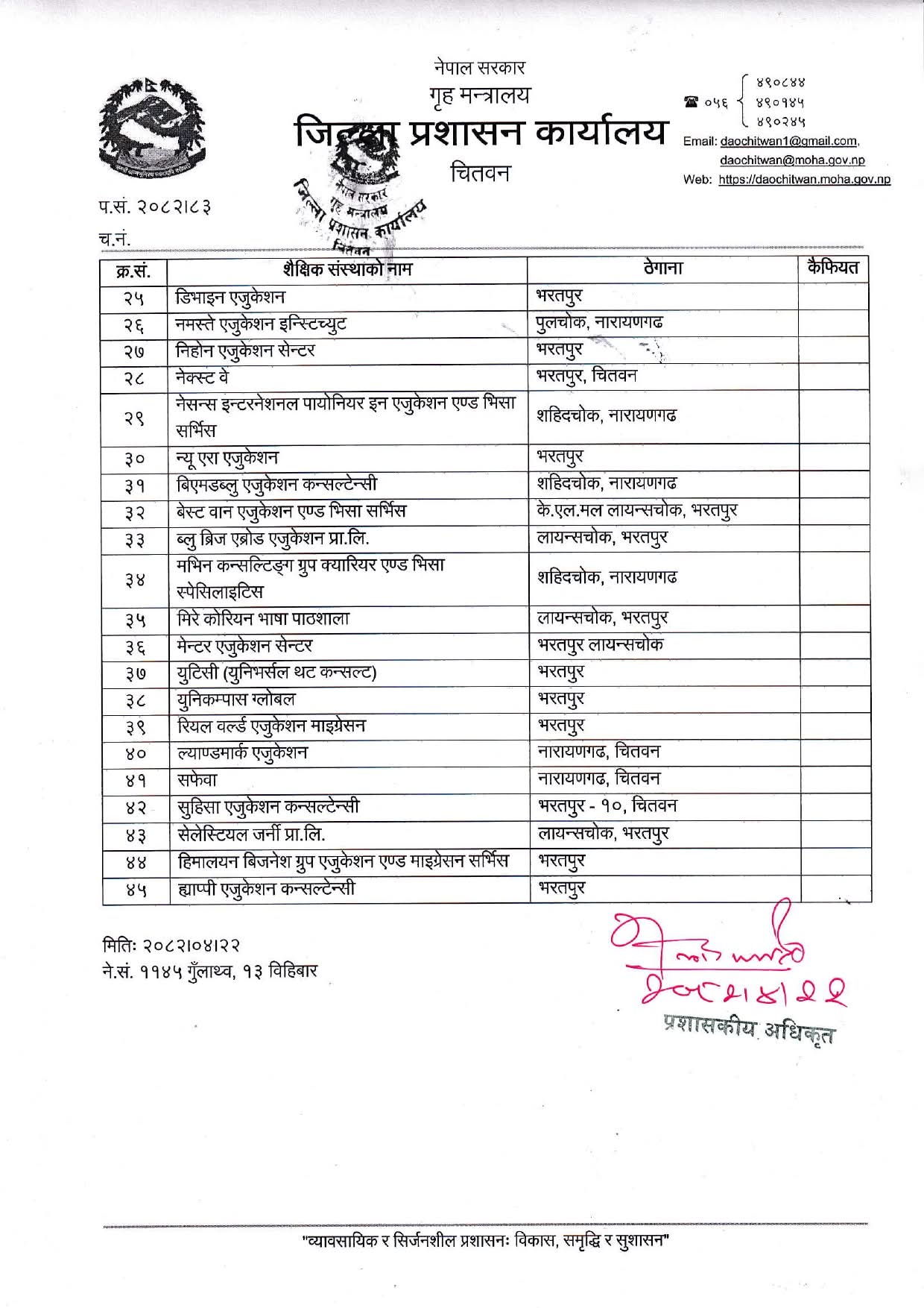 चितवन । शैक्षिक परामर्श तथा भाषा प्रशिक्षण सञ्चालन गर्दै आएका जिल्लाका ४५ वटा संस्थाहरू बन्द गर्न निर्देशन दिइएको छ ।