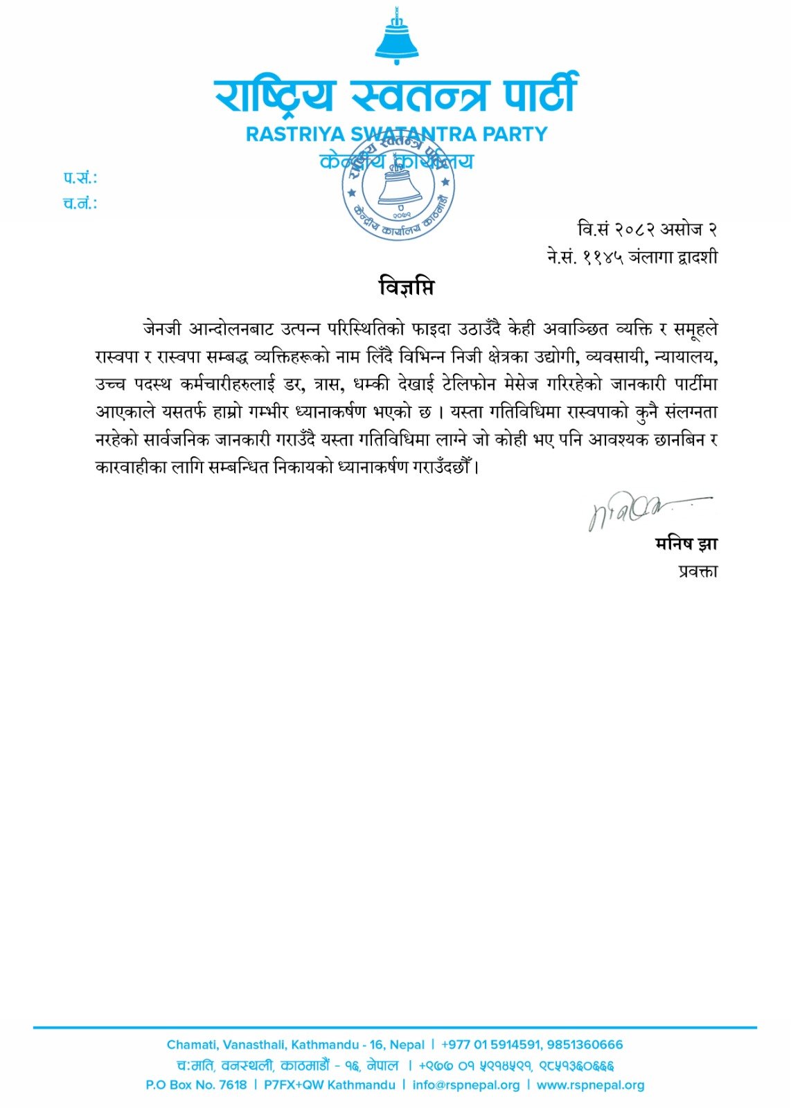 रास्वपाका प्रवक्ता मनिष झाले एक विज्ञप्ति जारी गर्दै पार्टीको नाम लिएर उद्योगी, व्यवसायी, न्यायालय, उच्च पदस्थ कर्मचारीहरूलाई डर, त्रास, धम्की देखाई टेलिफोन मेसेज गरिरहेको जानकारी आएको भन्दै ध्यानाकर्षण भएको जनाएको छ।रास्वपाले यस्ता गतिविधिमा लाग्ने जो कोही भए पनि आवश्यक छानबिन र कारबाहीका लागिसमेत अनुरोध गरेको छ। ‘जेन जेड आन्दोलनबाट उत्पन्न परिस्थितिको फाइदा उठाउँदै केही अवाञ्छित व्यक्ति र समूहले रास्वपा र रास्वपा सम्बद्ध व्यक्तिहरूको नाम लिँदै विभिन्न निजी क्षेत्रका उद्योगी, व्यवसायी, न्यायालय, उच्च पदस्थ कर्मचारीहरूलाई डर, त्रास, धम्की देखाई टेलिफोन मेसेज गरिरहेको जानकारी पार्टीमा आएकाले यसतर्फ हाम्रो गम्भीर ध्यानाकर्षण भएको छ ।’ विज्ञप्तिमा भनिएको छ, ‘यस्ता गतिविधिमा रास्वपाको कुनै संलग्नता नरहेको सार्वजनिक जानकारी गराउँदै यस्ता गतिविधिमा लाग्ने जो कोही भए पनि आवश्यक छानबिन र कारबाही लागि सम्बन्धित निकायको ध्यानाकर्षण गराउँदछौँ ।’ झाले यस्ता कार्यमा रास्वपाको कुनै संलग्नता नरहेको बताए ।