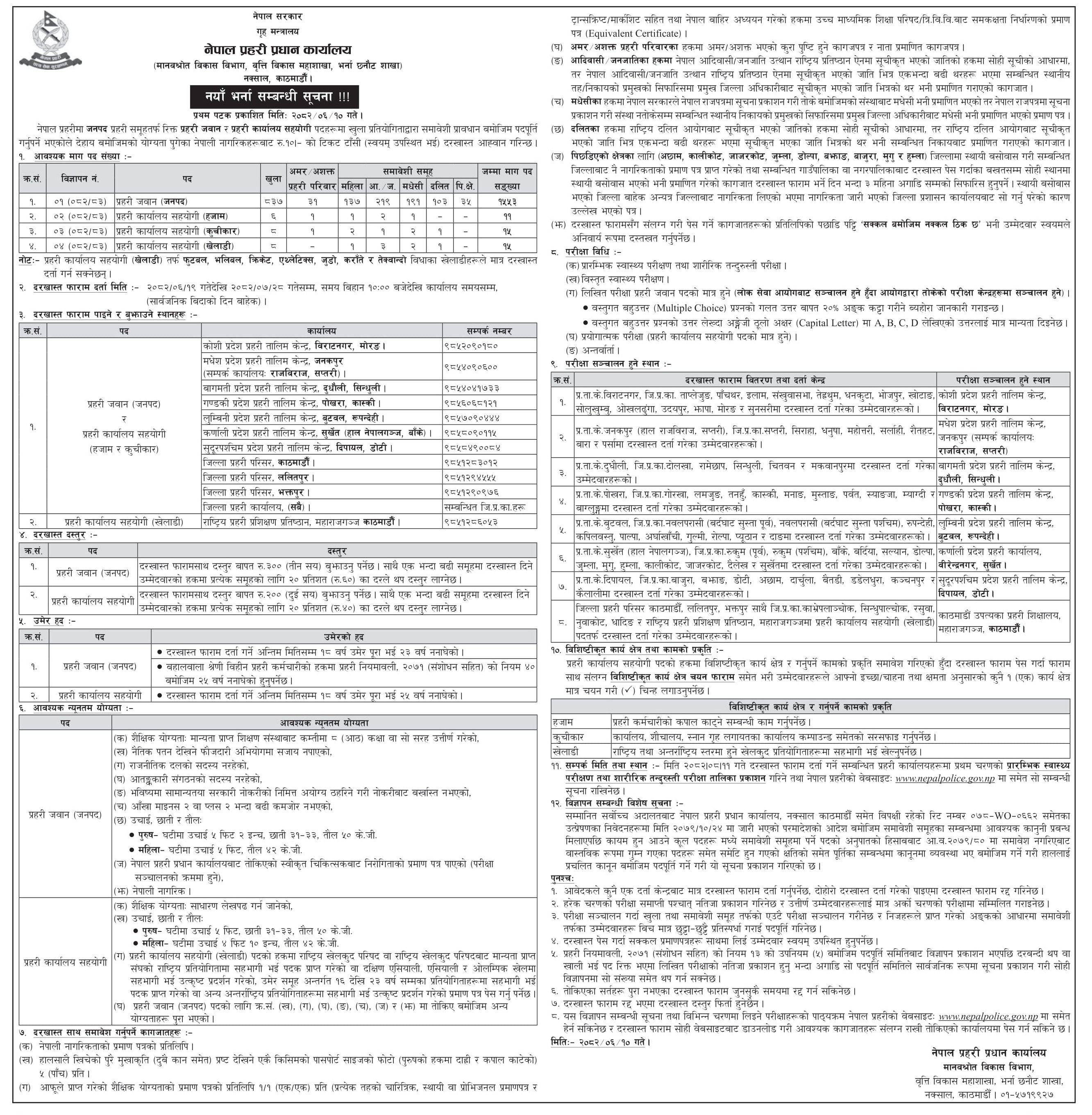 प्रहरी जवानका लागि न्यूनतम शैक्षिक योग्यता मान्यता प्राप्त शिक्षण संस्थाबाट कम्तीमा ८ कक्षा पास गरेको हुनुपर्ने सूचनामा उल्लेख छ। प्रहरी कार्यालय सहयोगीका लागि भने साधारण लेखपढ गर्न जानेको हुनुपर्ने उल्लेख छ ।