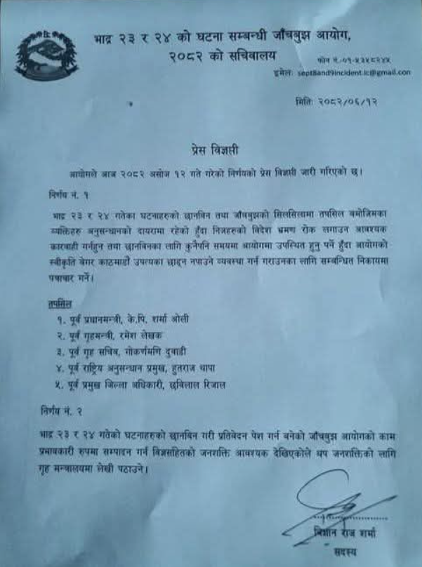 आयोगले पूर्वप्रधानमन्त्री ओली, पूर्वगृहमन्त्री रमेश लेखक, पूर्व गृहसचिव गोकर्णमणि दुवाडी, राष्ट्रिय अनुसन्धानका पूर्वप्रमुख हुतराज थापा र काठमाडौँका पूर्व सिडिओ छवि रिजालको पासपोर्ट रोक्का गर्न सिफारिस गरेको हो ।