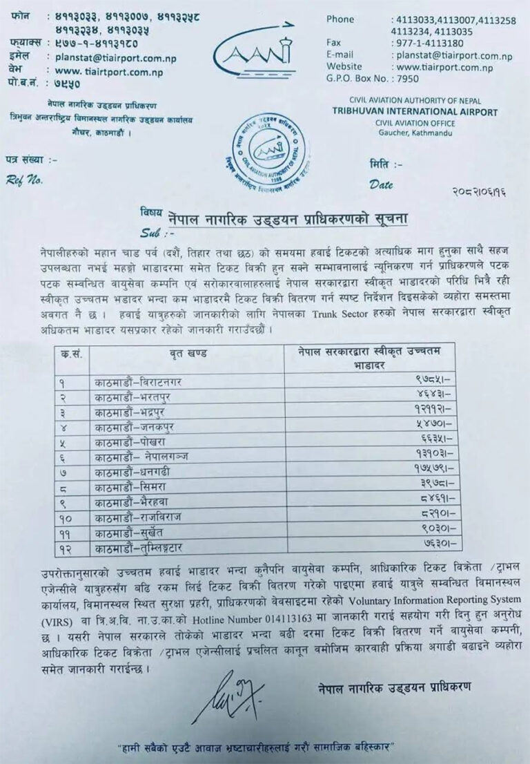दसैँ, तिहार तथा छठको समयमा हवाई टिकटको अत्यधिक मागका कारण सहज उपलब्धता नहुने र महँगोमा बिक्री हुने सम्भावना न्यूनीकरण गर्न प्राधिकरणले देशभित्रका विभिन्न गन्तव्यका लागि अधिकतम भाडादर तोकेको हो।