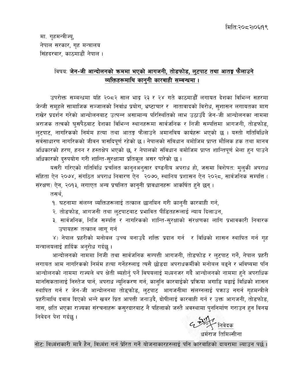 गृहको पत्रमा भनिएको छ,‘…काठमाडौंलगायत मुलुकका विभिन्न भागमा भएका भौतिक एवम् मानवीय क्षतिको यथार्थ छानविन गरी प्रतिवेदन पेश गर्न जाँचबुझ आयोग ऐन, २०२६ को दफा ३ बमोजिम जाँचबुझ आयोग गठन भई आयोगले मिति २०८२ आधिन ९ गतेदेखि कार्य प्रारम्भ गरेको छ’, मन्त्रालयले भनेको छ, ‘आयोगलाई भौतिक एवम् मानवीय क्षतिसँग सम्बन्धित सूचना वा निवेदन ग्रहण गरी विश्लेषण गर्ने र कारवाहीको सम्बन्धमा आवश्यक राय दिने समेतको कार्यदिश रहेको हुँदा आयोगबाट कार्यदिश बमोजिम रायसहितको प्रतिवेदन प्राप्त भएपछि सरकारले कानून बमोजिम गर्ने व्यहोरा जानकारी गराइन्छ। तसर्थ आयोगको कार्यक्षेत्रमा रहने विषयमा सरकारका नियमित संयन्त्रबाट तत्काल कारबाही अगाडि नबढाइने तर गैरकानुनी रुपमा भएका र हुने गतिविधिमा कानुनअनुसार कारबाही हुने व्यहोरासमेत सबैमा जानकारी गराइन्छ।’