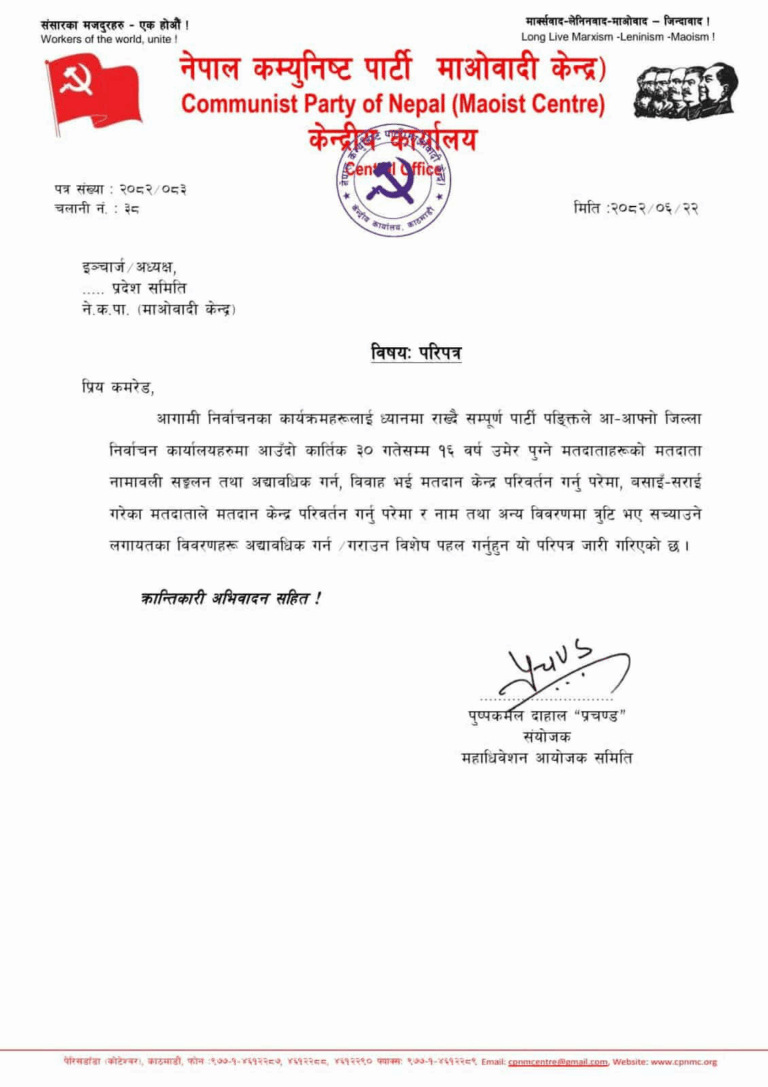 पार्टीका महाधिवेशन आयोजक समिति संयोजक पुष्पकमल दाहाल ‘प्रचण्ड’ द्वारा जारी गरिएको परिपत्रमा पार्टी कार्यकर्ताहरूलाई आगामी कार्तिक ३० गतेभित्र १६ वर्ष उमेर पुगेका नागरिकहरूको नाम समावेश गर्न, विवाह तथा बसाइँ सराइका कारण मतदान केन्द्र परिवर्तन गर्नु परेमा आवश्यक प्रक्रिया पुर्याउन, साथै नाम, जन्ममिति वा अन्य विवरणमा त्रुटि भएमा त्यसको सच्याउन पहल गर्न आग्रह गरिएको छ ।
