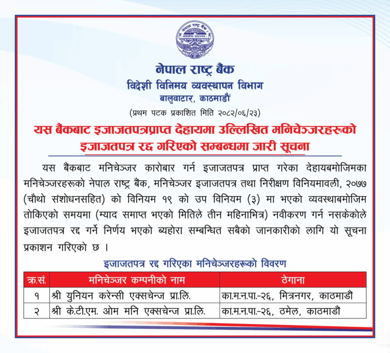 काठमाडौँ । नेपाल राष्ट्र बैंकले दुई वटा मनिचेन्जर कम्पनीको इजाजत पत्र (लाइसेन्स) रद्द गरेको छ।