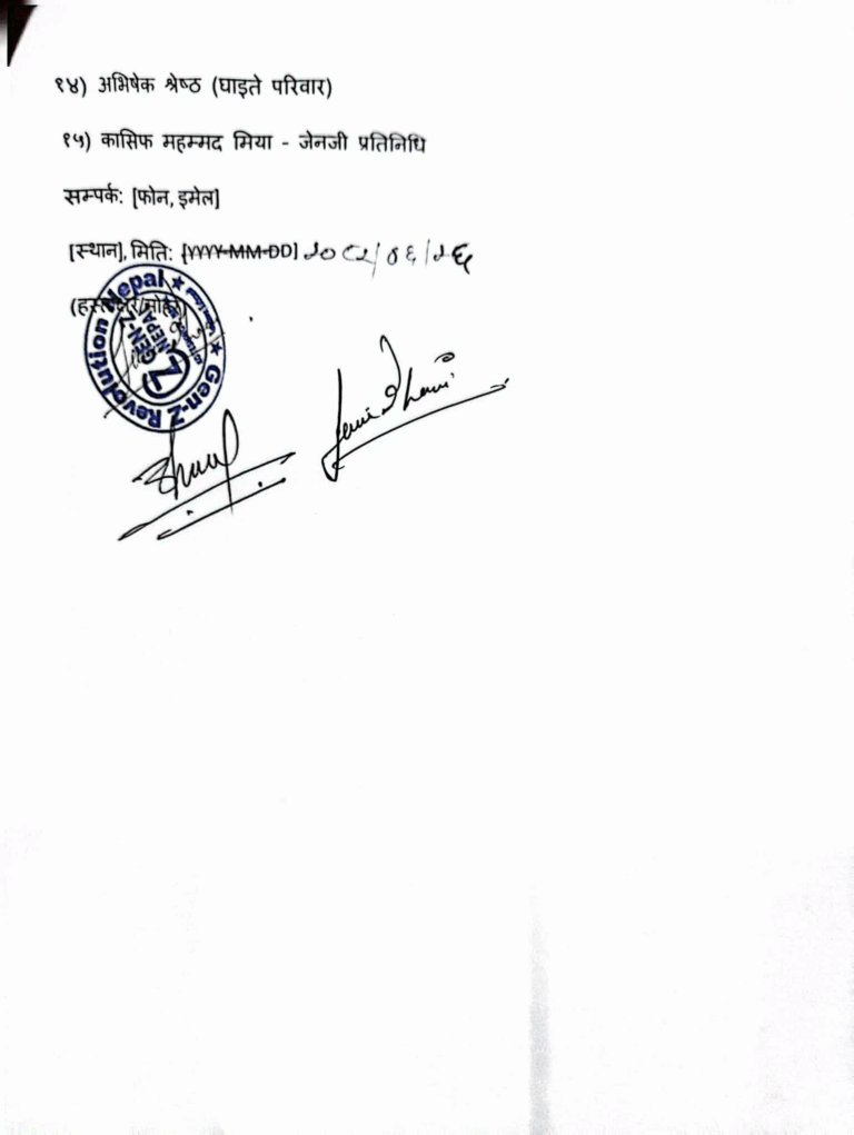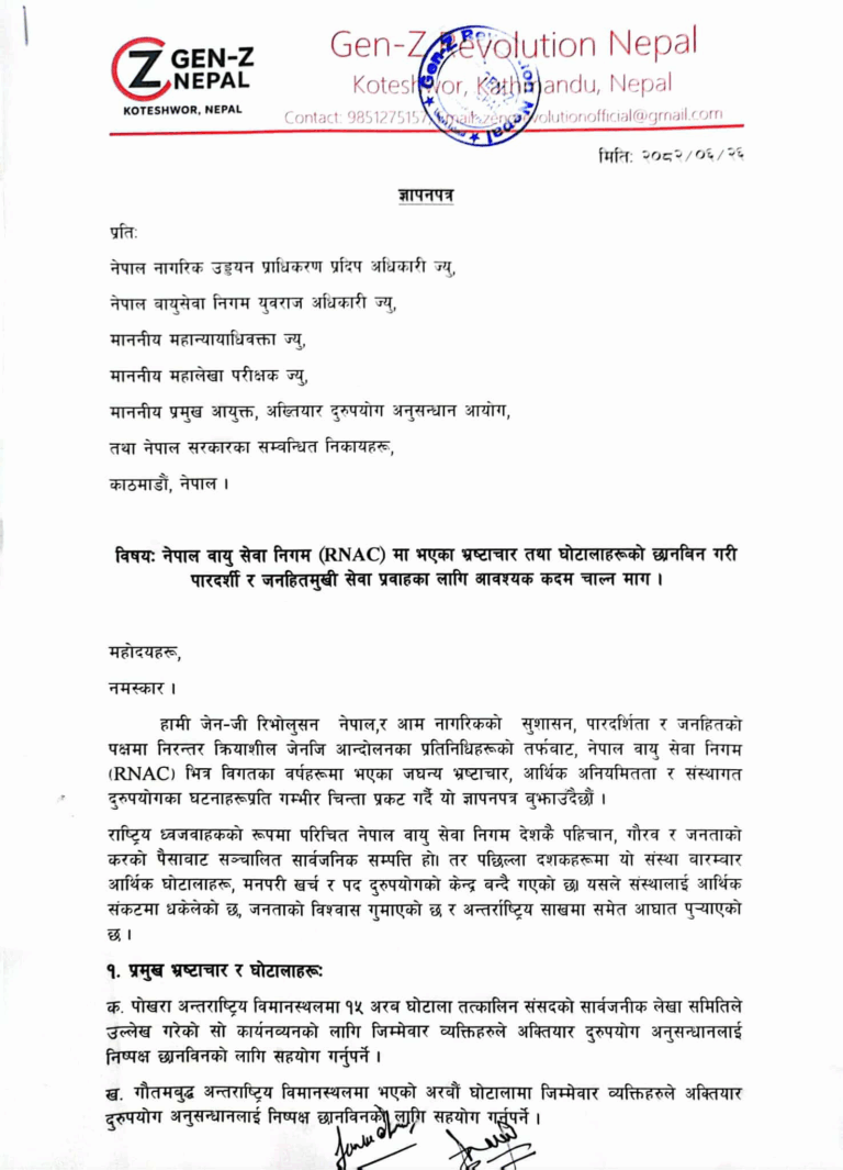अर्जुन शाही, मिराज ढुंगानालगायतको जेनजी टिमले नेपाल नागरिक उड्डयन प्राधिकरणका महानिर्देशक प्रदीप अधिकारी, नेपाल वायुसेवा निगम युवराज अधिकारी, महान्यायाधिवक्ता, महालेखा परीक्षक, अख्तियार दुरुपयोग अनुसन्धान आयोगका प्रमुख आयुक्त तथा नेपाल सरकारका सम्बन्धित निकायहरूमा नेवानीमा भएको बेथिति अन्त्य गर्न माग गर्दै ज्ञापनपत्र बुझाएका हुन् ।