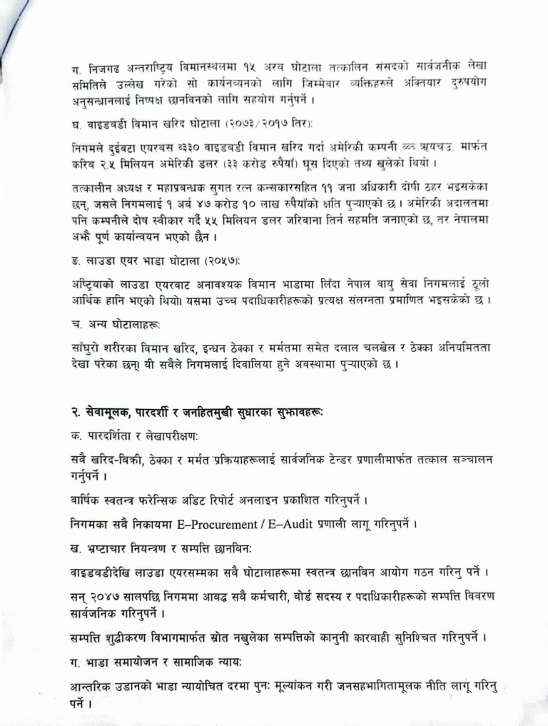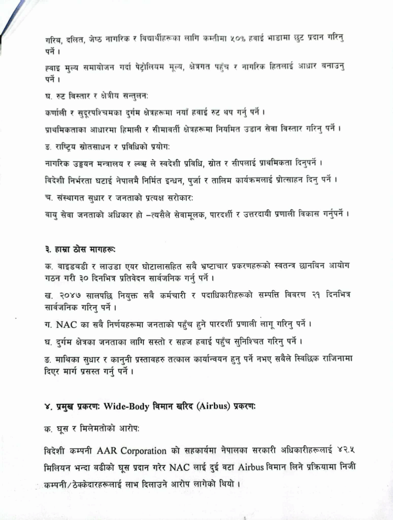 उनीहरूले वाइडवडी र लाउडा एयर घोटालासहित सबै भ्रष्टाचार प्रकरणहरूको स्वतन्त्र छानबिन आयोग गठन गरी ३० दिनभित्र प्रतिवेदन सार्वजनिक गर्नुपर्ने, २०४७ सालपछि नियुक्त सबै कर्मचारी र पदाधिकारीहरूको सम्पत्ति विवरण २१ दिनभित्र सार्वजनिक गरिनुपर्ने माग गरेका छन् ।