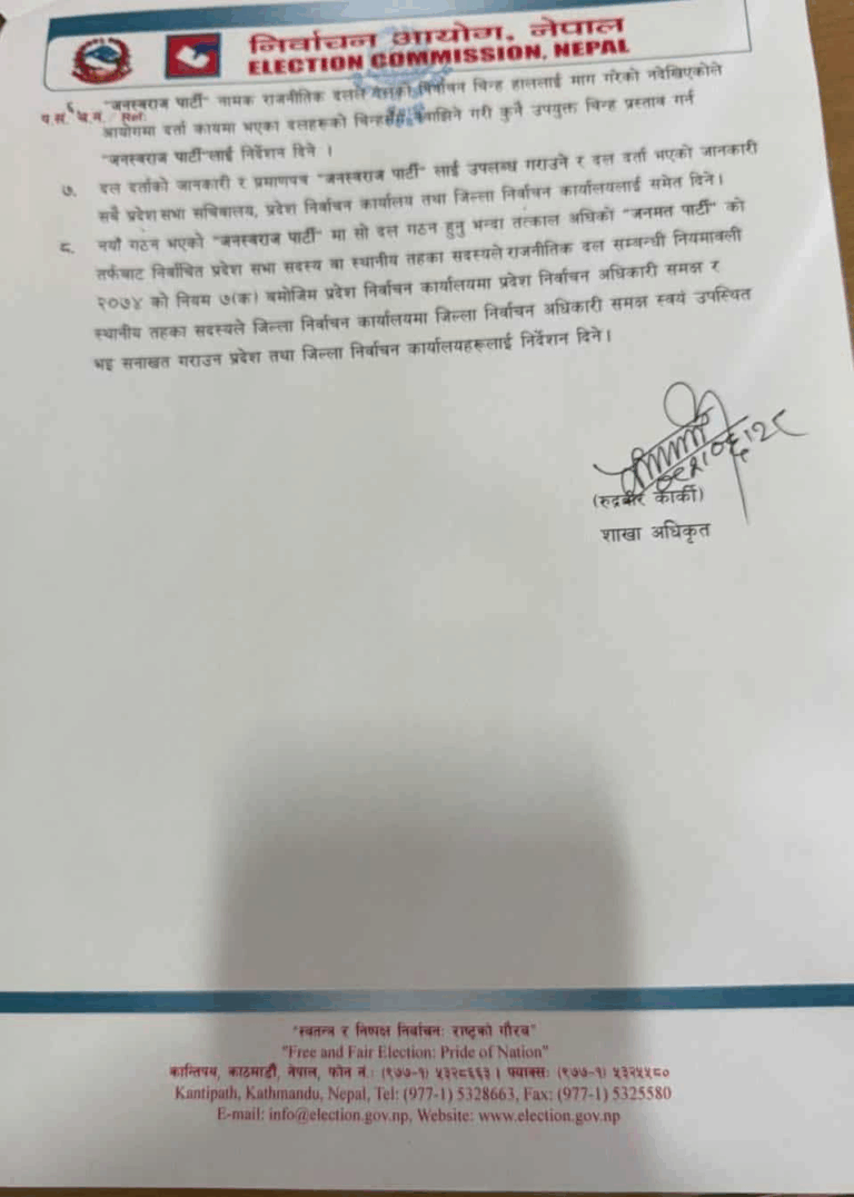 आयोगको मंगलबार बसेको बैठकले जस्वपालाई मान्यता दिँदै दल दर्ताका बाँकी प्रक्रिया पूरा गर्न निर्देशन दिएको निर्वाचन आयोगका शाखा अधिकृत रुद्रवीर कार्कीले जानकारी दिए ।