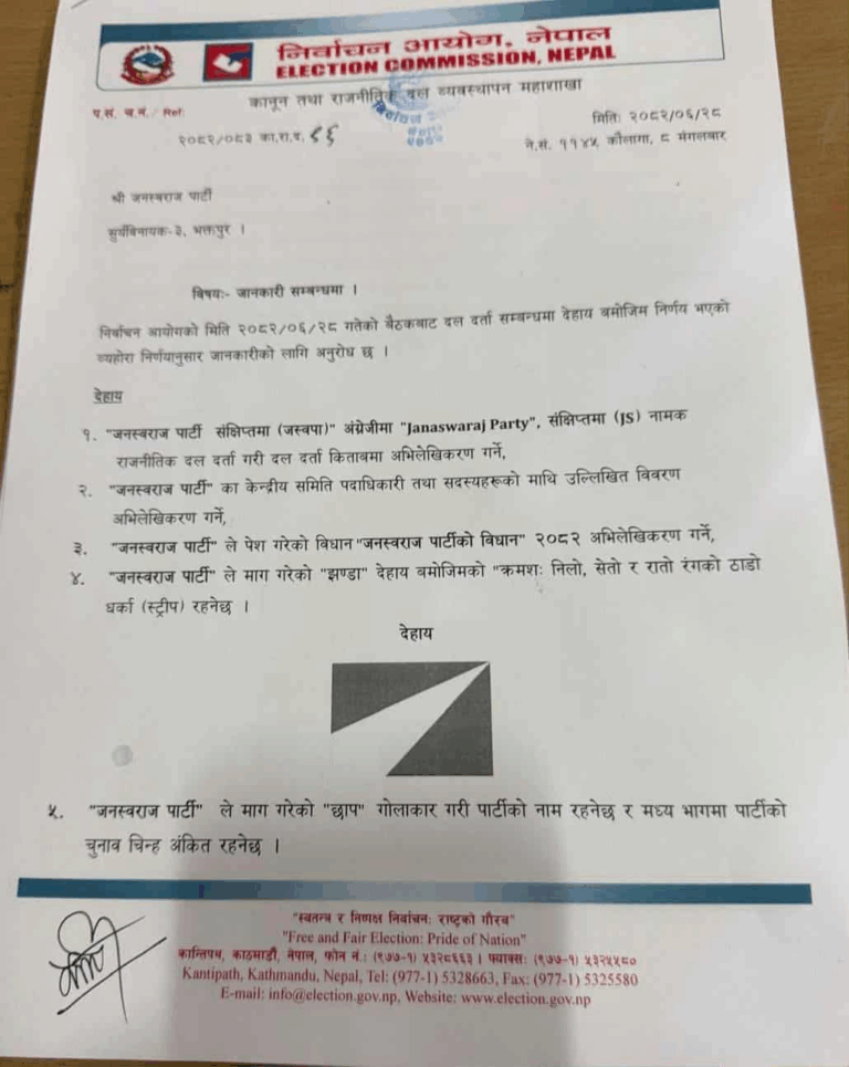 नव गठित पार्टीलाई निर्वाचन आयोगले मान्यता दिएको छ । नयाँ पार्टीको झण्डामा निलो, सेतो, रातो रङको ठाडो धर्का रहनेछ ।