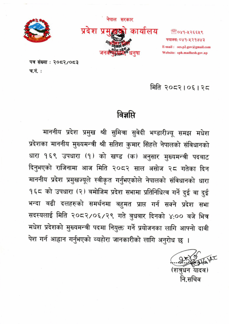 मुख्यमन्त्री सतिशकुमार सिंहले मंगलबार दिएको राजीनामा स्वीकृत गर्दै प्रदेश प्रमुख सुमित्रा सुवेदीले नयाँ सरकार गठनका लागि आह्वान गरेकी हुन् ।