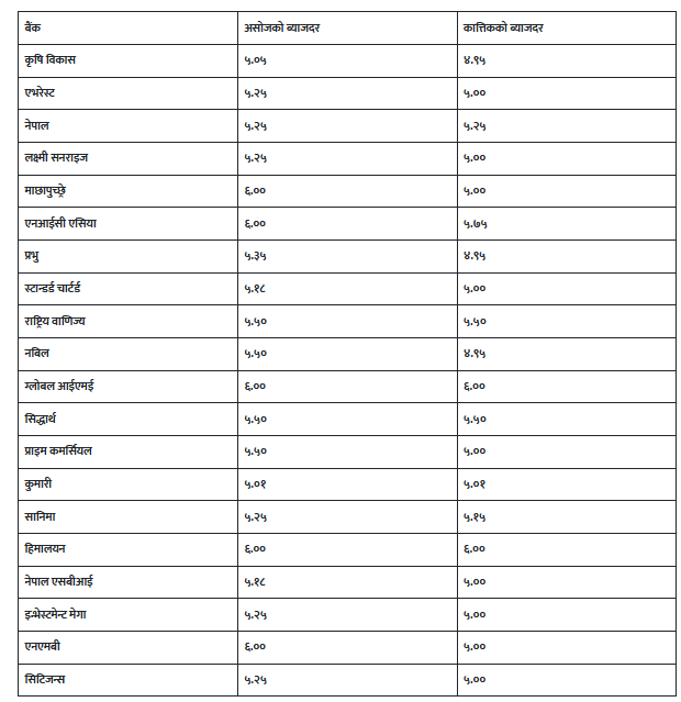 बैंक असोजको ब्याजदर कात्तिकको ब्याजदर