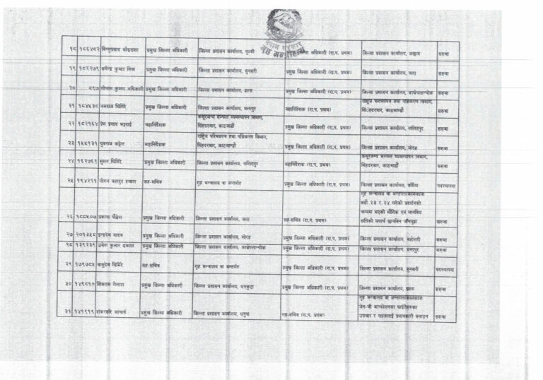 काठमाडौँ । गृह मन्त्रालयले देशभरका ३६ जना प्रमुख जिल्ला अधिकारी (प्रजिअ)हरूको सरुवा गरेको छ। मन्त्रालयले आइतबार रुपन्देही, कैलाली, महोत्तरी, पर्सा, बाँके, बर्दिया, रौतहट, कपिलवस्तु लगायतका जिल्लाका प्रमुख जिल्ला अधिकारीहरूलाई नयाँ जिल्लामा सरुवा गरेको हो।