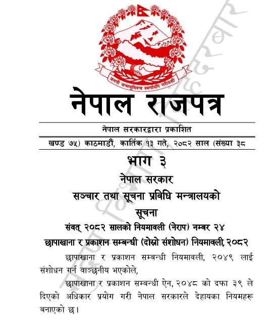 काठमाडौँ। सरकारले हालै जारी गरेको ‘छापाखाना र प्रकाशन सम्बन्धी (दोस्रो संशोधन) नियमावली, २०८२’ मार्फत अनलाइन सञ्चारमाध्यमलाई सूचना विभागको प्रत्यक्ष निगरानीमा ल्याएको छ ।