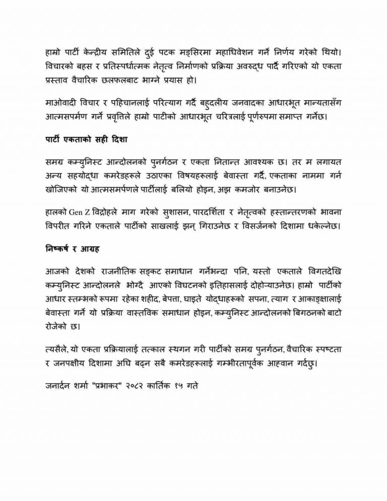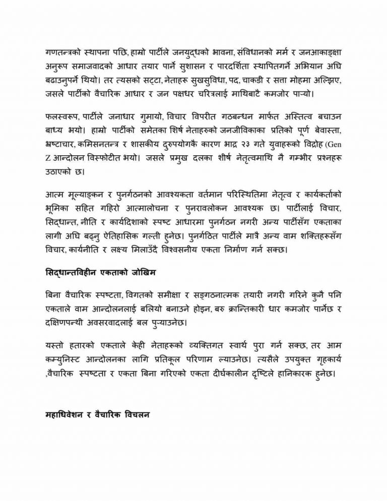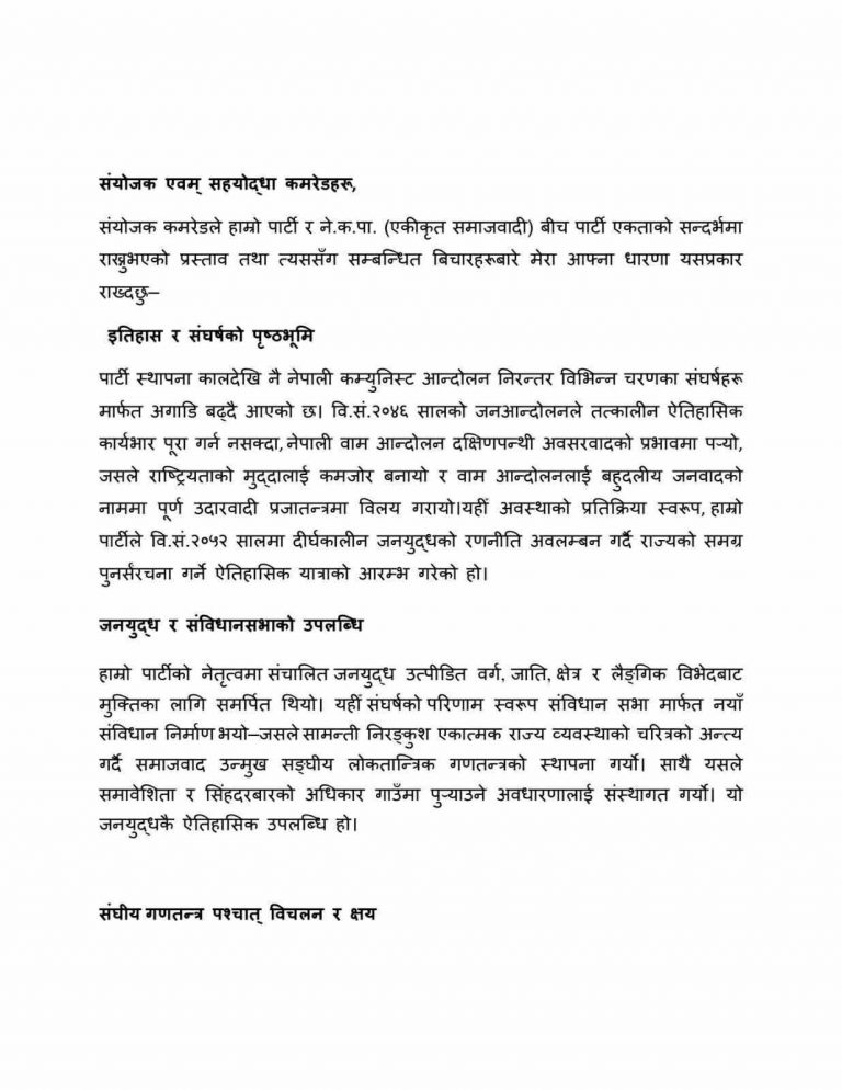 पेरिसडाँडामा बसेको सचिवालय बैठकमा लिखित रूपमा आफ्नो धारणा राख्दै एकता प्रक्रिया छाडेर पार्टी पुनर्गठनमा गर्नुपर्ने बताए।
