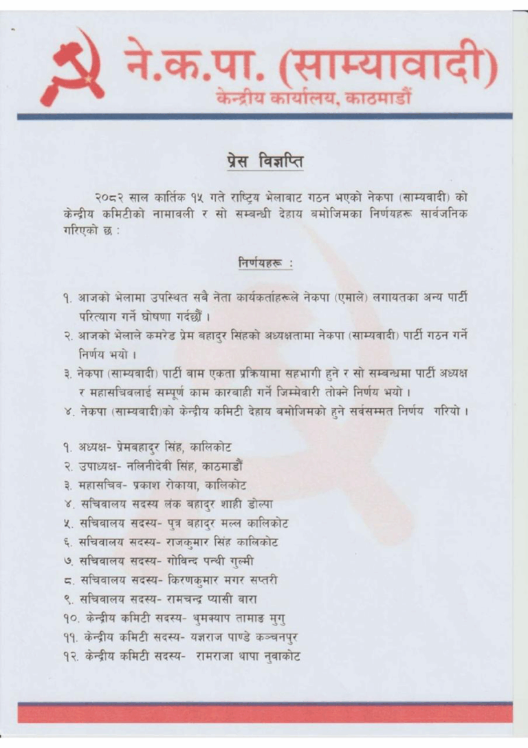 पार्टीमा ५१ जनाको केन्द्रीय कमिटी रहने विज्ञप्तिमा छ ।