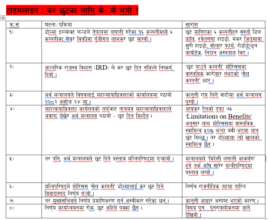 मोरिससलाई ट्याक्स हेभन मानिन्छ । त्यहाँ दर्ता भएको सेल कम्पनीले नेपालमा नाफा कमाएर बाहिर लैजान खोज्दा कर छुट दिनु, राजस्व सार्वभौमिकता विरुद्ध मानिन्छ । यसले अरू विदेशी लगानीकर्ताले पनि ‘सेल कम्पनी’ बनाएर कर नतिर्ने बाटो खोलिदिन सक्छ । अर्थात् – यो केवल डोल्माको केस होइन, नेपालको कर शासनको भविष्यको दिशा निर्धारण गर्ने मुद्दा पनि हो । त्यसपछि यसमा प्रश्न उठेपछि मुख्यसचिव एकनारायण अर्यालले भने त्यसलाई अहिले प्रमाणिकरण नगरी त्यक्तिकै रोकेर राखिदिएका छन् ।