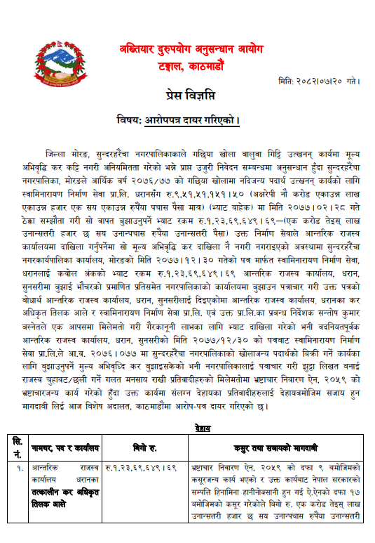 आयोगले बिहीबार आन्तरिक राजस्व कार्यालय धरानका तत्कालीन कर अधिकृत तिलक आलेसहित दुई जनाविरुद्ध भ्रष्टाचार मुद्दा दायर गरेको हो । यस्तै अख्तियारले एक निर्माण सेवा प्रा.लि. उपर पनि मुद्दा दायर गरेको छ ।