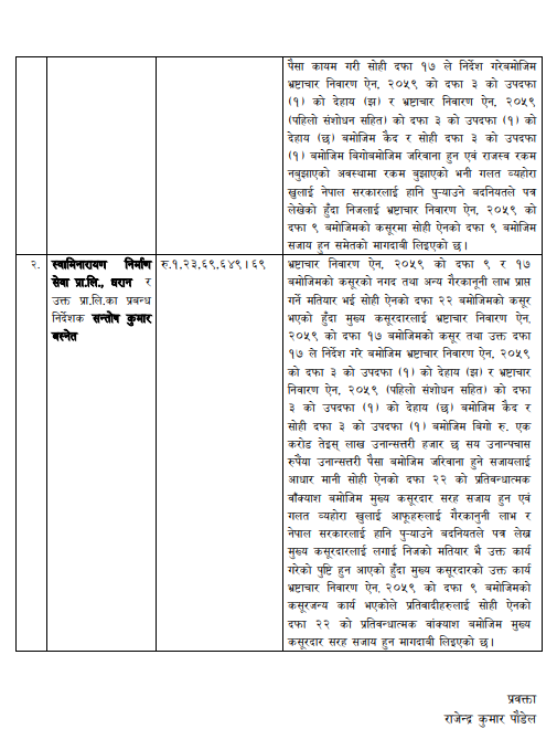 उनीहरूले गलत लिखत तयार गरी/गराई सार्वजनिक सम्पत्तिमा हानि नोक्सानी पुर्याई भ्रष्टाचार गरेको आरोपमा मुद्दा दायर गरिएको प्रवक्ता राजेन्द्र कुमार पौडेलले बताए ।