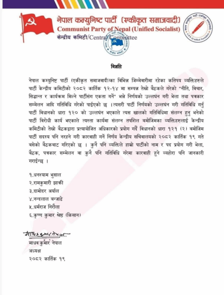 घनश्याम भुसाल, रामकुमारी झाँक्री, किसान श्रेष्ठ, दामोदर अर्याल, नन्दलाल बन्जाडे र धर्मराज निरौलालाई पार्टीबाट कारबाही गरिएको अध्यक्ष माधव कुमार नेपालले जारी गरेको विज्ञप्तिमा उल्लेख छ ।