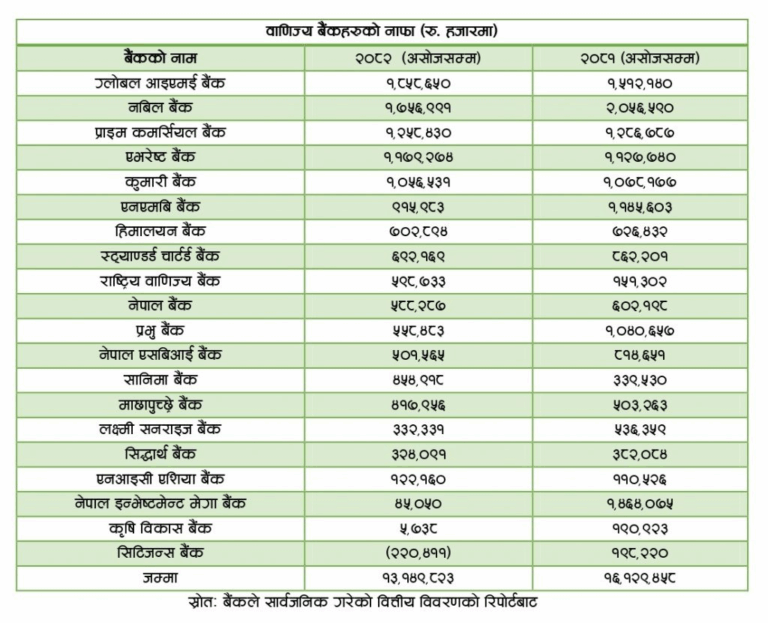 यो नाफा गत आवको सोही अवधिको तुलनामा १८.४७ प्रतिशतले कम हो । जबकि गत आर्थिक वर्ष २०८१/८२ को सोही अवधिमा बैंकहरूले १६ अर्ब १२ करोड ९४ लाख रुपैयाँ नाफा कमाएका थिए ।