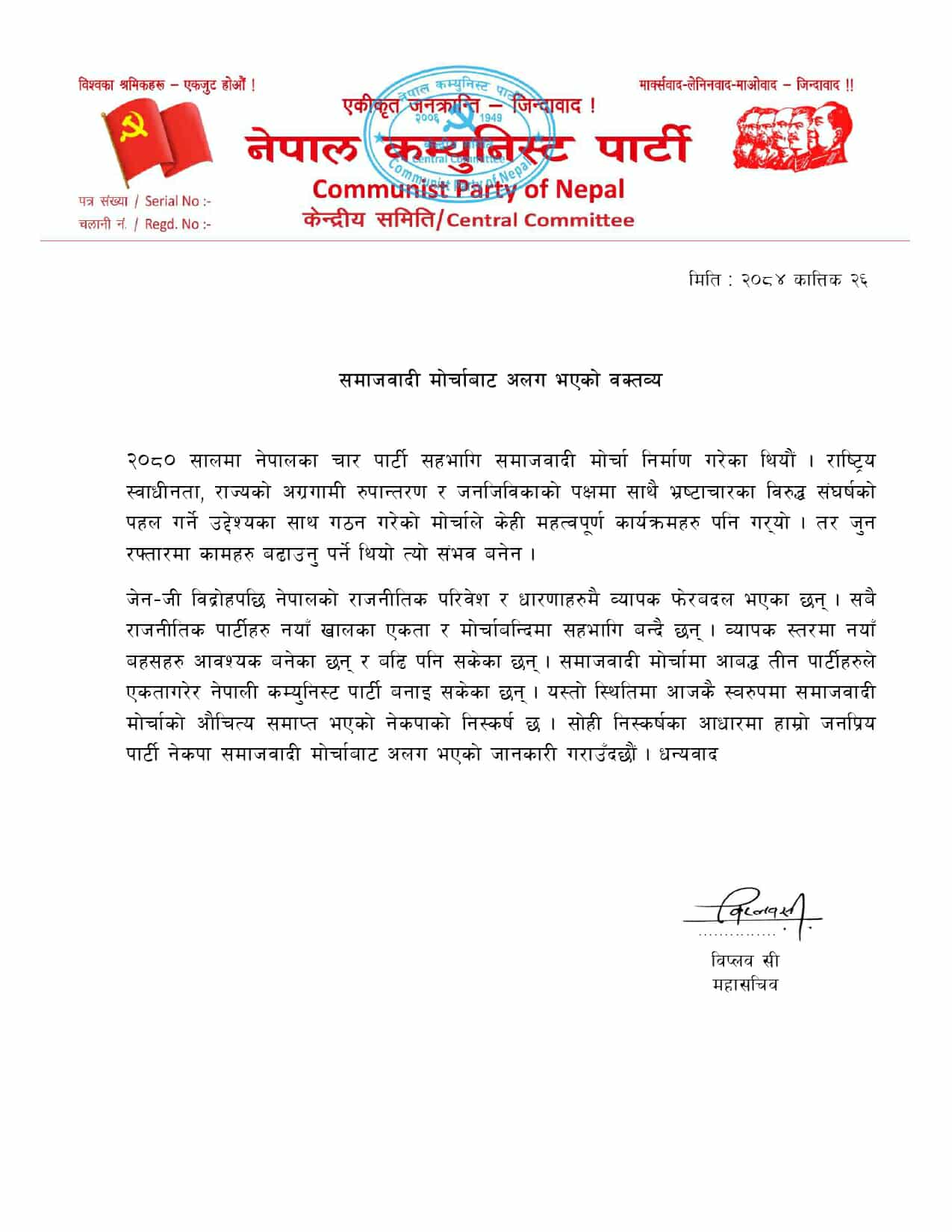 पार्टीका महासचिव नेत्रविक्रम चन्द ‘विप्लव’ ले एक विज्ञप्तिमार्फत २०८० सालमा चार दलको सहभागितामा गठन भएको ‘समाजवादी मोर्चा’ वर्तमान परिस्थितिमा औचित्यहीन बनेको बताएका छन् ।