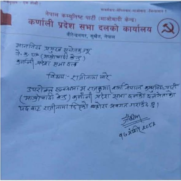 आज एक वक्तव्य जारी गर्दै उनले माओवादी केन्द्र कर्णाली प्रदेश सभा संसदीय दलको नेता पदबाट राजीनामा दिएको बताएका हुन् ।