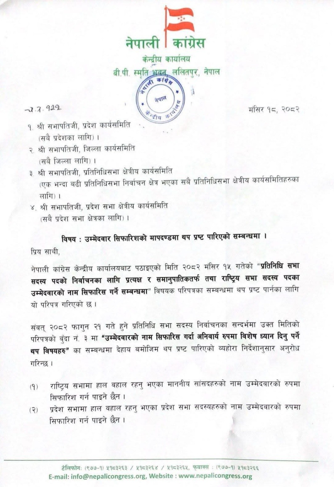 त्यसक्रममा कांग्रेसले कस्ता ब्यक्ति उम्मेदवार बन्न पाउने र त्यसका लागि तल्ला कमिटिले कसरी सिफारिस गर्ने भन्ने विषयमा परिपत्र गरेको थियो । तर, परिपत्रमा हाल बहाल रहेका जनप्रतिनिधिहरुका सवालमा के गर्ने भन्ने प्रष्ट नभएको गुनासो आएपछि कांग्रेसले यस विषयमा थप प्रष्ट पार्न अर्काे परिपत्र जारी गरेको हो ।