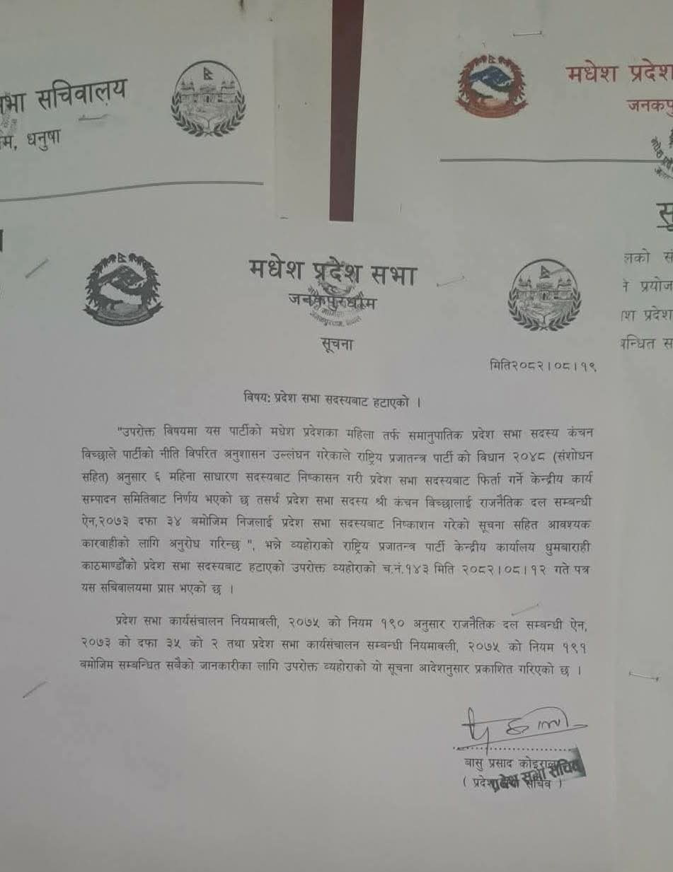 काठमाडौँ । राप्रपा नेपालकी मधेश प्रदेश सांसद कञ्चन विच्छा पदमुक्त भएकी छिन् । मधेस प्रदेश सभाले शुक्रबार विच्छालाई सांसद पदबाट हटाएको सूचना जारी गरेको छ ।