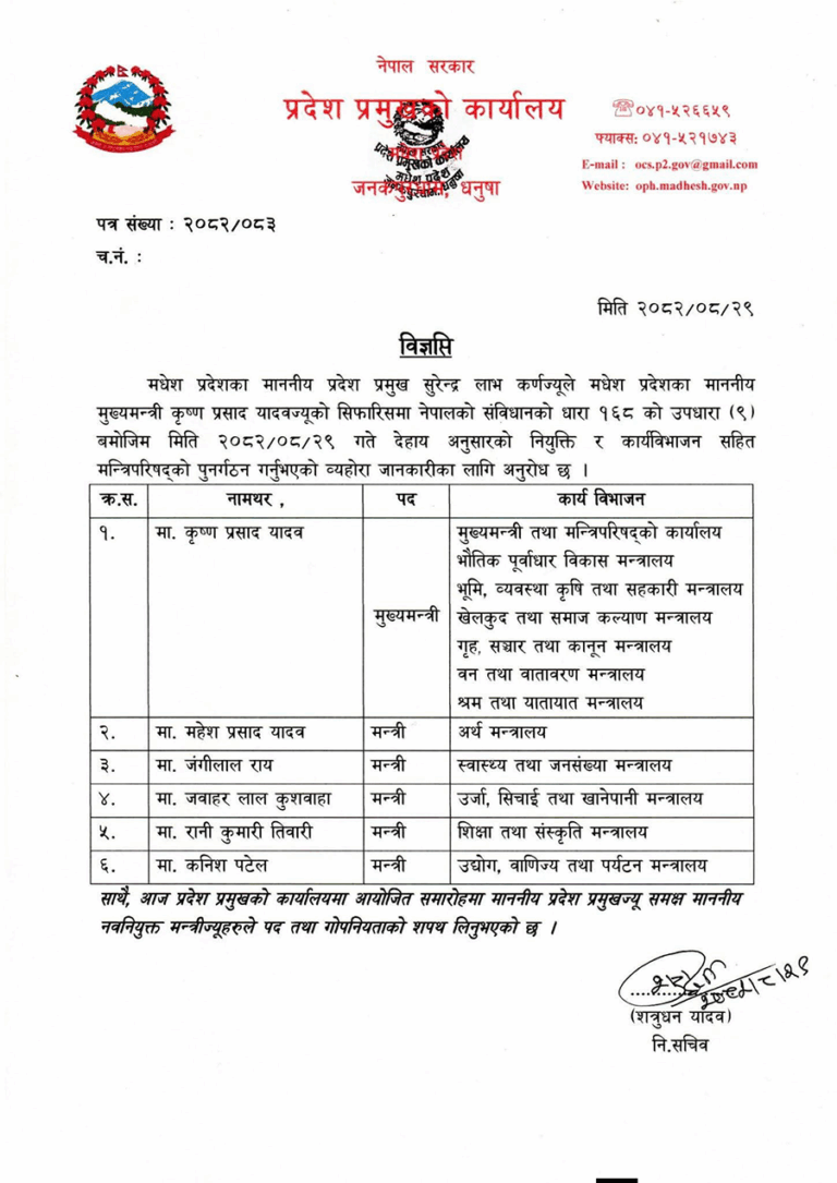 जनमत पार्टीका महेशप्रसाद यादवले यसअघि नै अर्थ मन्त्रालयको जिम्मेवारी पाएका थिए। यससँगै मधेश प्रदेश सरकारको मन्त्रिपरिषद् ६ सदस्यीय बनेको छ।