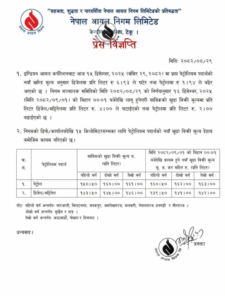 डिजेल र मट्टीतेलको मूल्य भने घटाइएको छ । डिजेल र मट्टीतेलको मूल्य लिटरमा चार रुपैयाँले घटाइएको हो ।