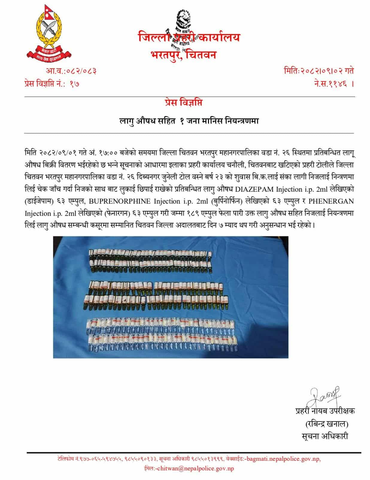 जिल्ला प्रहरी कार्यालय चितवनका अनुसार दिउँसो करिब ३:०० बजेको समयमा भरतपुर महानगरपालिका–२६ स्थित दिव्यनगरमा लागुऔषध बिक्री–वितरण भइरहेको सूचनाका आधारमा इलाका प्रहरी कार्यालय जुगेडीबाट खटिएको प्रहरी टोलीले चेकजाँच गरेको थियो।