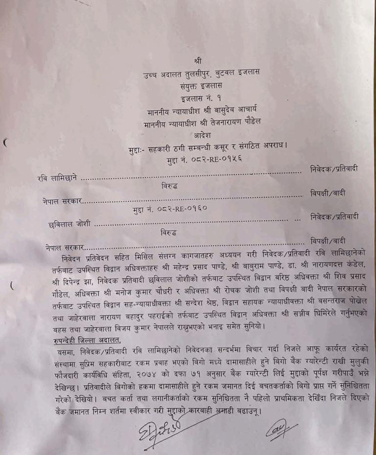 काठमाडौँ । तुलसीपुर उच्च अदालत, बुटवल इजलासले राष्ट्रिय स्वतन्त्र पार्टीका सभापति रवि लामिछानेलाई धरौटीमा रिहा गर्ने आदेश गरेको छ ।
