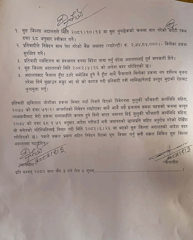 उच्चले बिगो बराबर २ करोड ६८ लाख रुपैयाँ धरौटी माग गर्ने आदेश गरेको हो । उच्चले धरौटी माग गरेपछि सो बराबरको रकम बुझाएर उनी थुनामुक्त हुने छन्
