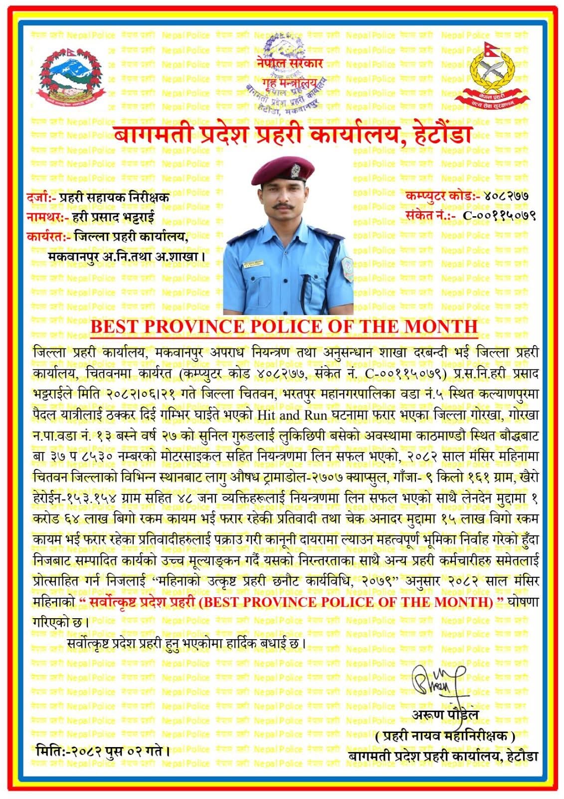 त्यसैगरी, २०८२ साल मंसिर महिनामा चितवन जिल्लाका विभिन्न स्थानबाट लागू औषध ट्रामाडोल २७०७ क्याप्सुल, गाँजा ९ किलो ९६९ ग्राम, खैरो हेरोइन २५३।५४५ ग्रामसहित ४५ जना व्यक्तिहरूलाई नियन्त्रणमा लिन सफल भएको, साथै लेनदेन मुद्दामा १ करोड ६४ लाख बिगो रकम कायम भई फरार रहेका प्रतिवादी तथा चेक अनादर मुद्दामा १५ लाख बिगो रकम कायम भई फरार रहेका प्रतिवादीहरूलाई पक्राउ गरी कानुनी दायरामा ल्याउन महत्वपूर्ण भूमिका निर्वाह गरेको हुँदा निजबाट सम्पादित कार्यको उच्च मूल्याङ्कन गर्दै निरन्तरताको साथ अन्य प्रहरी कर्मचारीहरू समेतलाई प्रोत्साहित गर्न जिल्लालाई “महिनाको सर्वोत्कृष्ट प्रदेश प्रहरी छनोट कार्यविधि, २०७९” अनुसार २०८२ साल मंसिर महिनाको सर्वोत्कृष्ट प्रदेश प्रहरी घोषणा गरिएको हो।