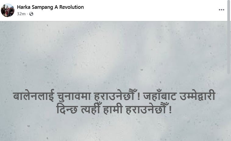 धरान उपमहानगरपालिकाका मेयर समेत रहेका साम्पाङले लेखेका छन्, ‘बालेनलाई चुनावमा हराउनेछौँ ! जहाँबाट उम्मेदवारी दिन्छ त्यहीँ हामी हराउनेछौँ ’’