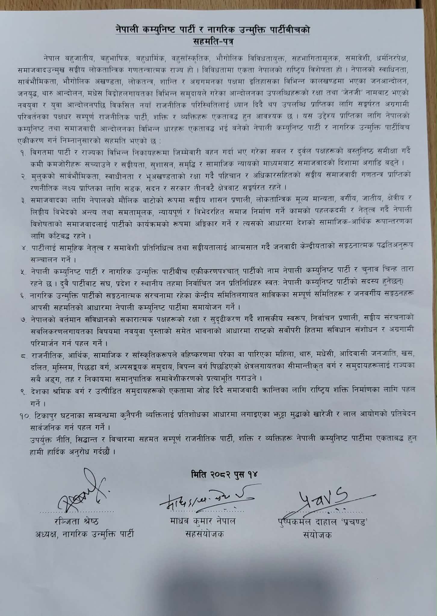 नाउपाको तर्फबाट अध्यक्ष रन्जिता श्रेष्ठ नेकपाको तर्फबाट संयोजक पुष्पकमल दाहाल र सहसंयोजक माधव कुमार नेपालले हस्ताक्षर गरेका छन् ।
