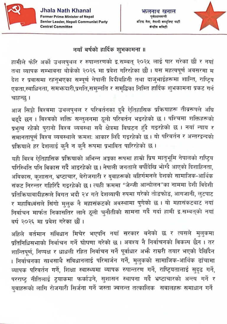 अंग्रेजी नयाँ वर्षको शुभकामना सन्देश दिँदै खनालले जेन जेड आन्दोलनका नाममा देशलाई महाविपत्तिको अवस्थामा लगिएको र यसमा पश्चिमा शक्ति अनि नेपालभित्रका उनीहरूका मान्छे संलग्न रहेको आरोप समेत लगाएका छन् ।