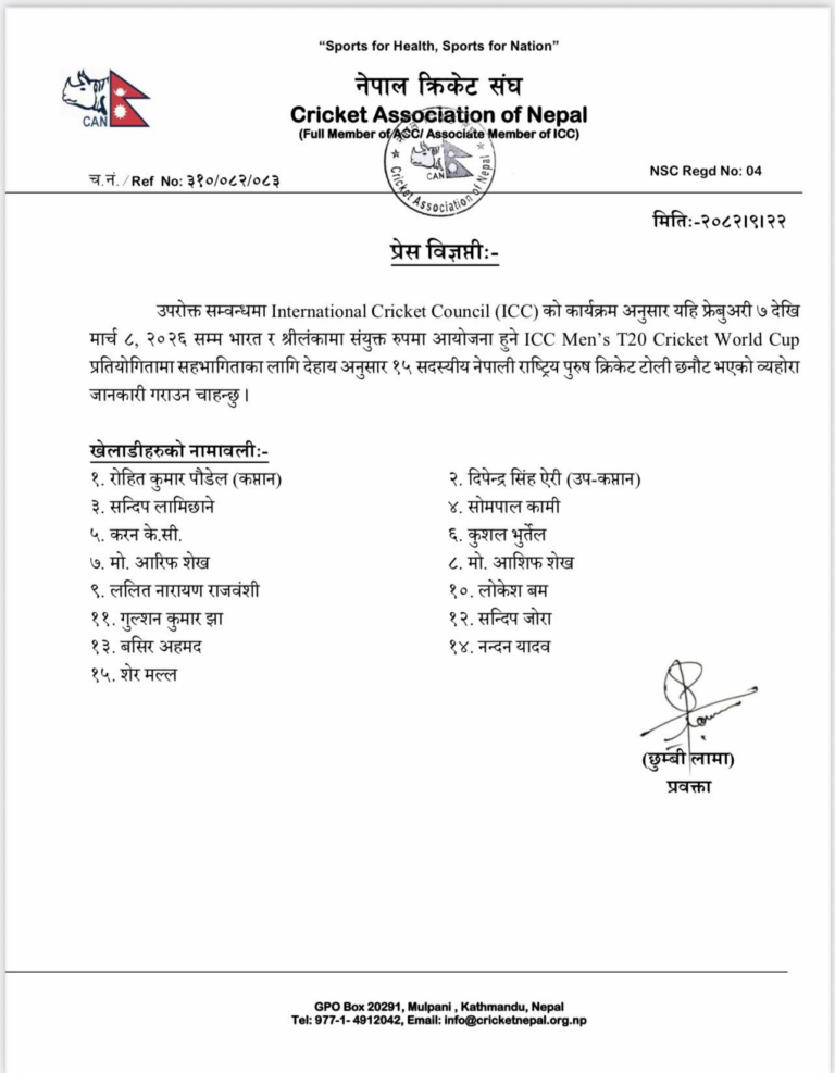 काठमाडौं । आई सिसी पुरुष टी-२० क्रिकेट विश्वकप खेल्ने नेपाली टोली घोषणा भएको छ। नेपाल क्रिकेट संघ क्यानले रोहितकुमार पौडेलको कप्तानीमा १५ सदस्यीय टोली घोषणा गरेको हो।