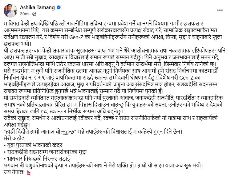 काठमाडौँ। सामाजिक अभियन्ता आशिका तामाङले आगामी प्रतिनिधि सभा निर्वाचनमा स्वतन्त्र उम्मेदवारी दिने घोषणा गरेकी छन् ।