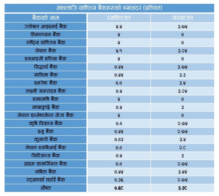 बैंकहरूले सार्वजनिक गरेको नयाँ ब्याजदर अनुसार व्यक्तिगत मुद्दती निक्षेपको अधिकतम ब्याजदर औषतमा ४.६८ प्रतिशत विन्दुमा झरेको छ । पुस महिनामा ४.८३ प्रतिशत विन्दुमा थियो ।