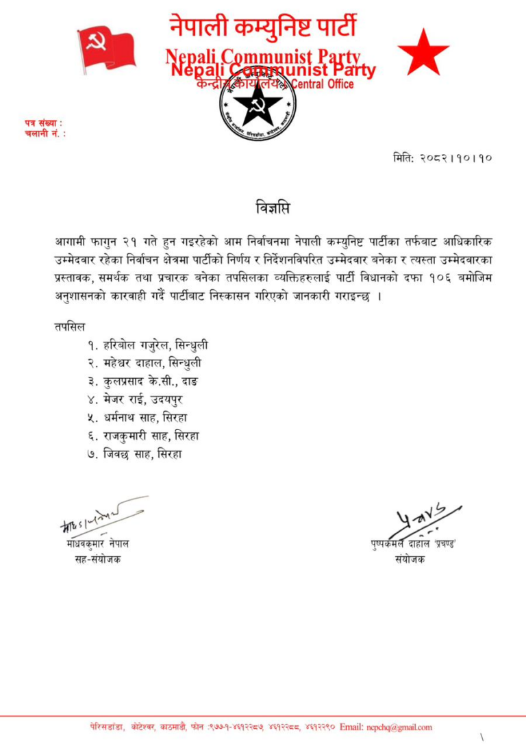 जारी विज्ञप्तिमा भनिएको छ, ‘आगामी फागुन २१ गते हुन गइरहेको आम निर्वाचनमा नेपाली कम्युनिस्ट पार्टीका तर्फबाट आधिकारिक उम्मेदवार रहेका निर्वाचन क्षेत्रमा पार्टीको निर्णय र निर्देशनविपरित उम्मेदवार बनेका र त्यस्ता उम्मेदवारका प्रस्तावक, समर्थक तथा प्रचारक बनेका तपसिलका व्यक्तिहरूलाई पार्टी विधानको दफा १०६ बमोजिम अनुशासनको कारबाही गर्दै पार्टीबाट निष्कासन गरिएको जानकारी गराइन्छ।’