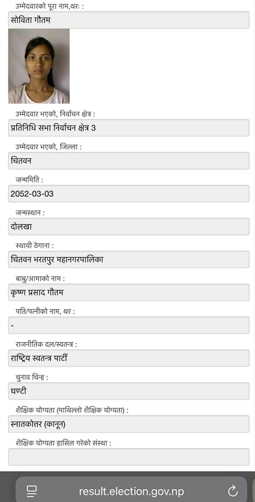 प्रतिनिधि सभा सदस्य उम्मेदवार बनेकी सोविता गौतमले निर्वाचन आयोगमा झुठ्ठो विवरण पेश गरेको खुलेको छ । आफूले अध्ययन नै नगरेको शैक्षिक योग्यता उल्लेख गरेर आयोगलाई झुक्याइएको तथ्य फेला परेको छ ।