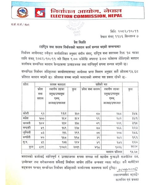 काठमाडौँ । आइतबार सम्पन्न राष्ट्रिय सभा निर्वाचनमा देशभर उच्च सहभागिता देखिएको छ। निर्वाचन आयोगका अनुसार कुल मतदातामध्ये ९५.६८ प्रतिशतले मतदान प्रक्रियामा सहभागिता जनाएका छन्।